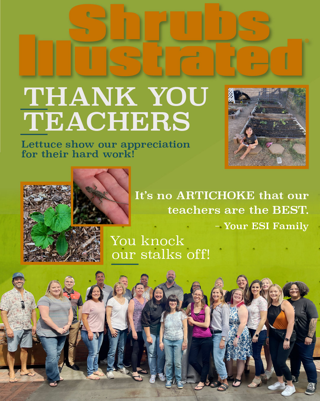 Here at ESI we love a good pun (and a good home-grown garden). From all of us here at ESI, we can't thank you enough for your sacrifices and resiliency that are transforming students every single day. You deserve to be celebrated for Teacher Appreciation Week, so we're giving you the gift of laughter to show our gratitude for YOU!